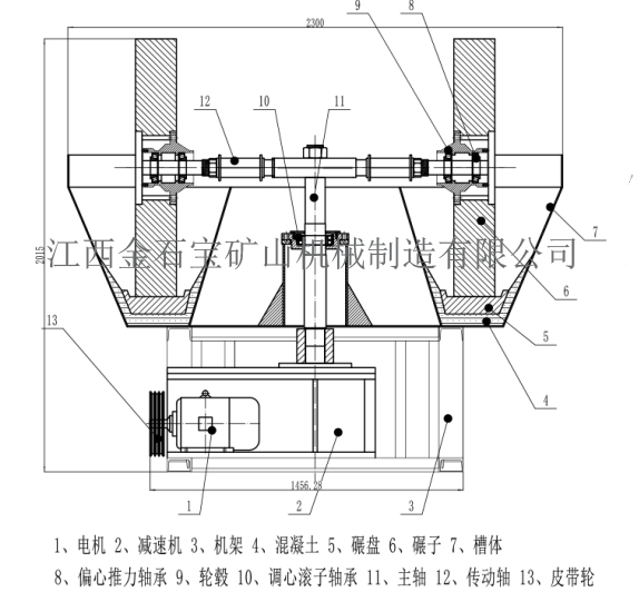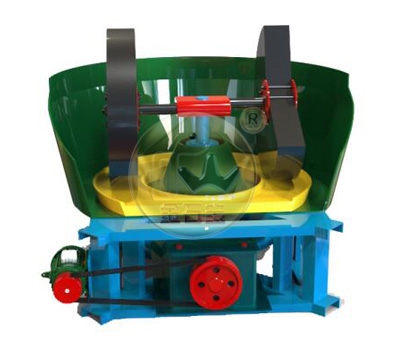 该设备主要动力装置、机架、水盆、碾轮、碾盘等部件组成,采用轮动式磨矿工作方式:首先电动机将动力传动至减速机,在减速机带动下,通过大立轴将力矩传递给上方的横轴,然后经安装在横轴两端的拉杆传递至碾轮,使碾轮产生驱动力,沿横轴水平方向做逆时针旋转运动;工作时的碾轮既能围绕湿碾机大立轴公转,又能围绕碾轮中心轴进行自转,碾盘则固定不动。添加的矿石物料,在碾磨机内受到来自,碾轮自身重量带来的挤压力,碾轮公转自转时与碾盘产生的巨大摩擦力,在受到反复的挤压、揉搓、研磨后,被彻底粉碎