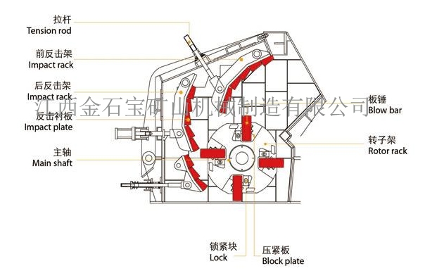主要由拉杆、前反击架、后反击架、反击衬板、主轴、锁紧块、压紧板、转子架、板锤、反击板、转子等组成